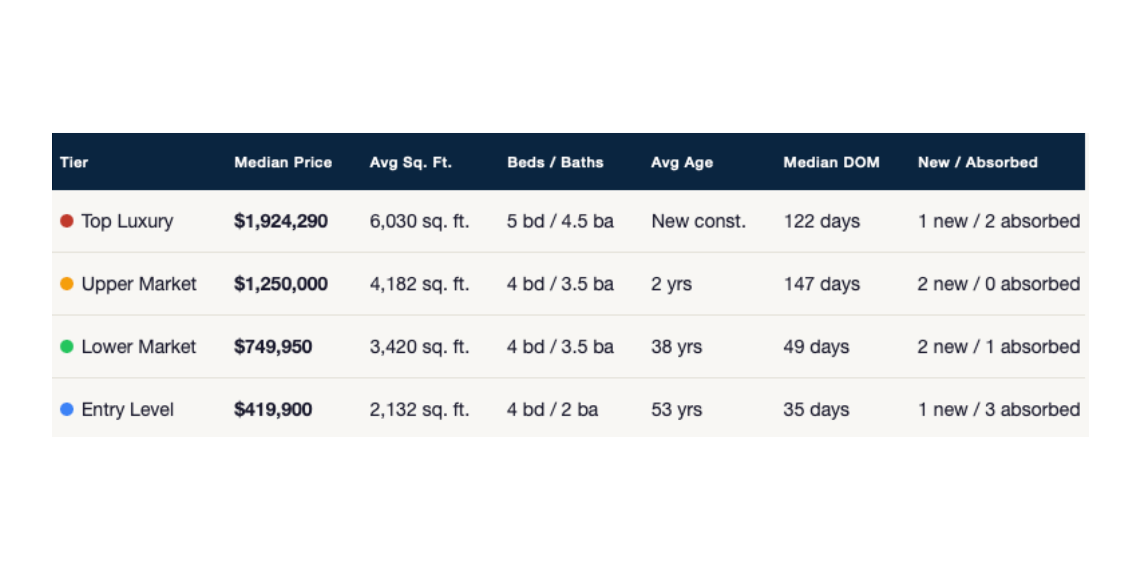 Notice something? The entry-level tier (under $450K) is the fastest-moving segment at just 35 days on market, and it's absorbing three homes for every one that comes on. That's fierce competition for buyers in that range. The upper luxury tier ($1.25M) is sitting longer at 147 days â patience pays for sellers there, but overpricing still stings.